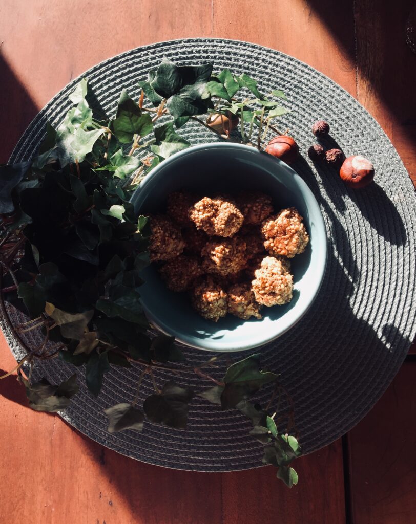 –> Alle Zutaten vermengen und kleine Kugeln formen. Das Blech geht dann für ca. 45 Minuten in den Ofen.